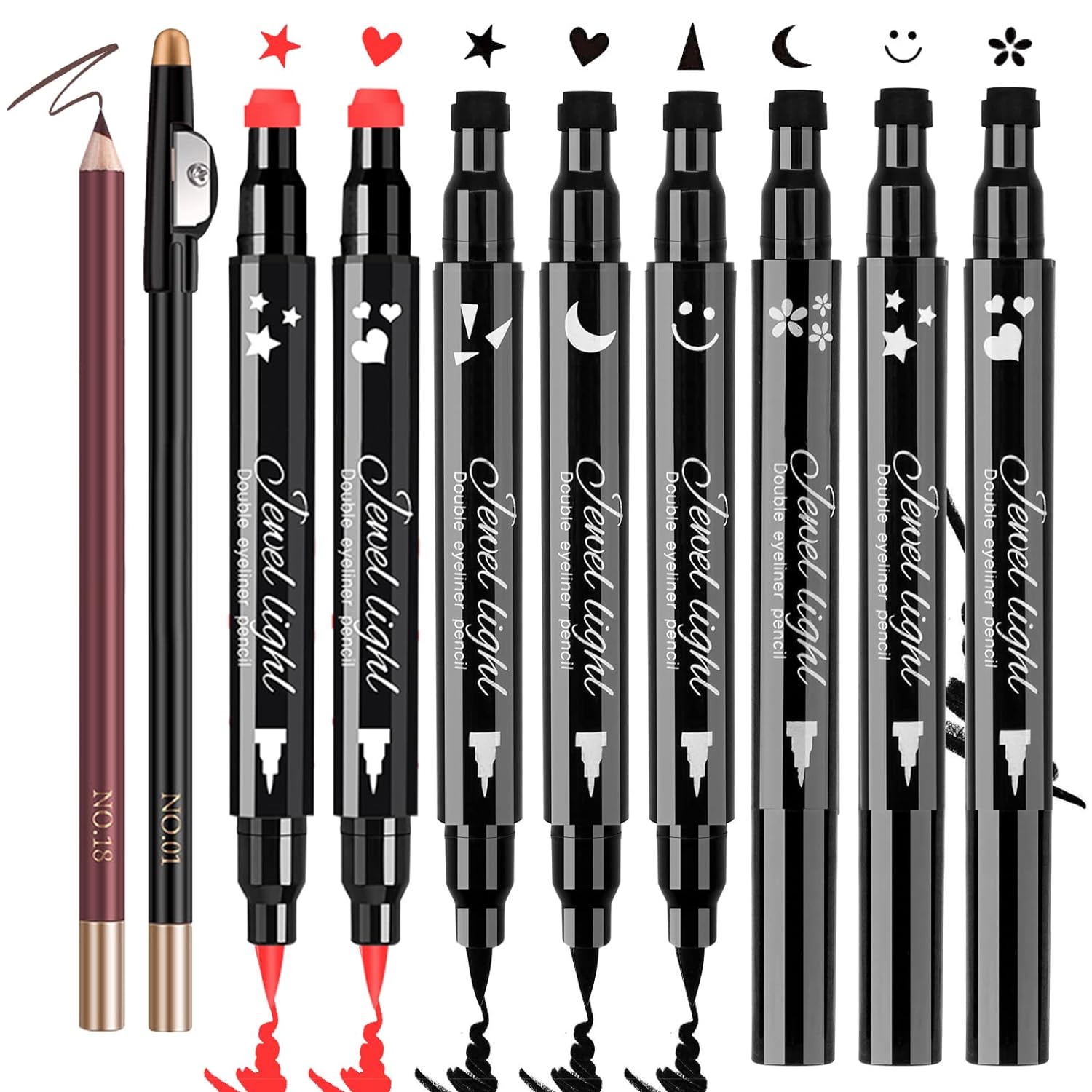 10 Pack Liquid Eyeliner Stamp Set with 8Pcs Eyeliner Stamp and 2Pcs Eyebrow Pencil, Waterproof Smudgeproof Eyeliner Long Lasting Eyeliner Pen (Heart/Flower/Moon/Star/Smiley /Triangle Seal Stamp)